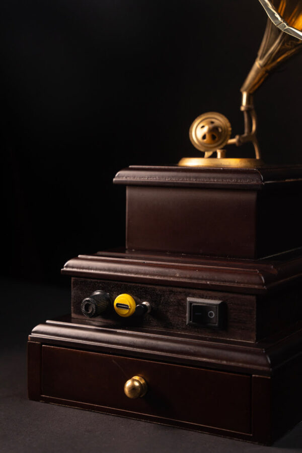 The gramophone-style horn amplifies preloaded bhajans without distractions, while the drawer allows incense to gently perfume the space, creating a complete sensory experience.